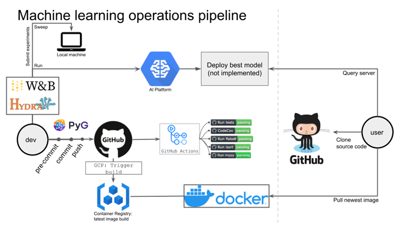 Continue working on your project, checking off bullet points from the checklist. We recommend that you start by creating an architectural overview of your project similar to this figure, which needs to be included in your report. I recommend using draw.io for creating this kind of diagram, but feel free to use any tool you like.