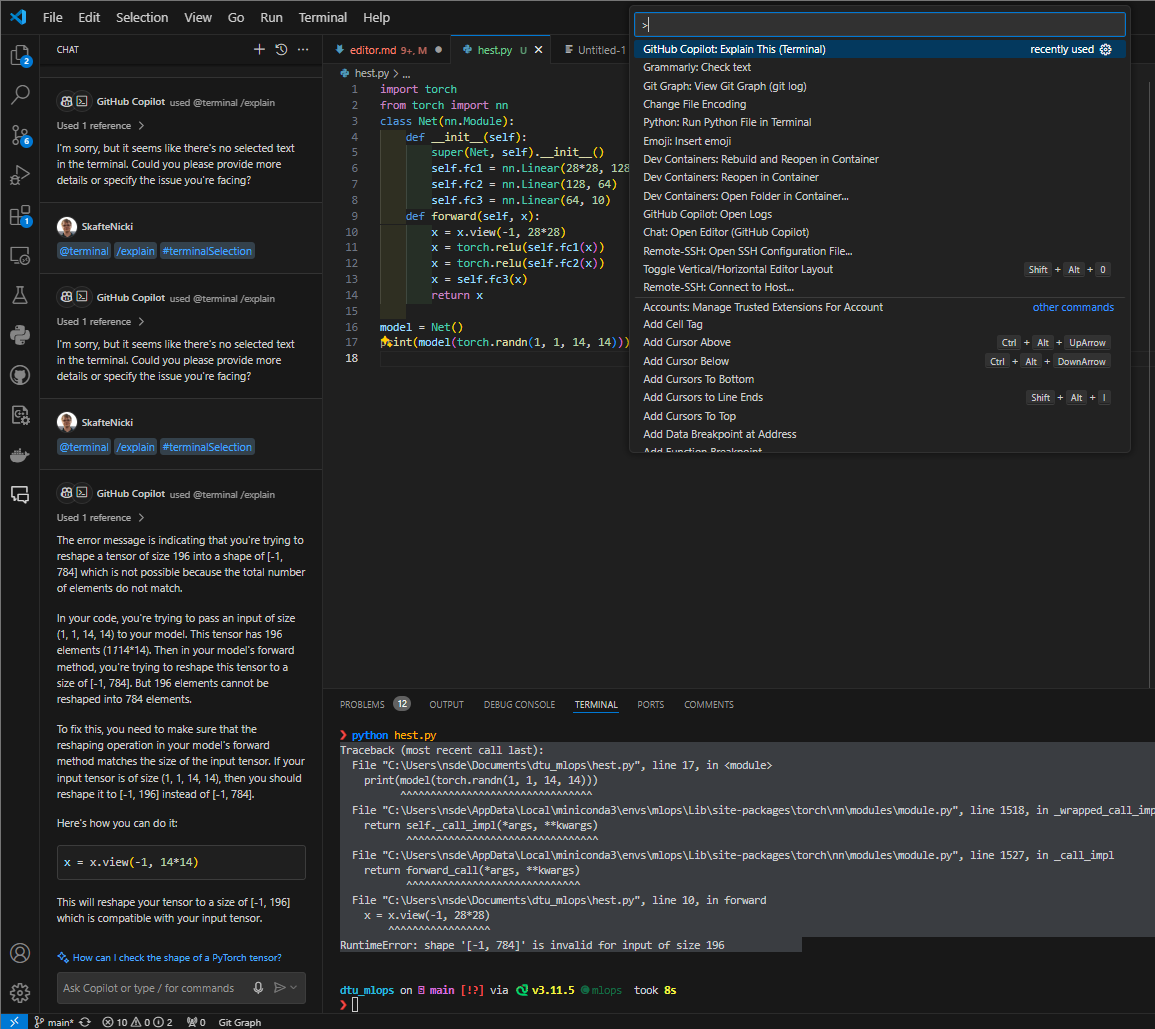 Chaticon in the Activity bar and begin to ask questions similar to how you would ask ChatGPT. However, we also have the option of providing context either from the code editor or the terminal. Try saving the following code in a Python script calledcopilot.py:import torch from torch import nn class Net(nn.Module): def __init__(self): super(Net, self).__init__() self.fc1 = nn.Linear(28*28, 128) self.fc2 = nn.Linear(128, 64) self.fc3 = nn.Linear(64, 10) def forward(self, x): x = x.view(-1, 28*28) x = torch.relu(self.fc1(x)) x = torch.relu(self.fc2(x)) x = self.fc3(x) return x model = Net() print(model(torch.randn(1, 1, 14, 14)))and run it in the terminal: