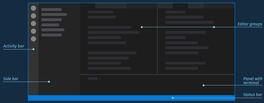 The editor: This is where your code is. VS Code supports several layouts in the editor (one column, two columns, etc.). You can make a custom layout by dragging a file to where you want the layout to split.