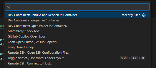 Remote-Containers: Reopen in ContainerorRemote-Containers: Rebuild and Reopen in Container. Choose either of these options.This will start a new VS Code instance inside a Docker container. You should be able to see this in the bottom left corner of your VS Code window. You should also be able to see that the Python interpreter has changed to the one inside the container.