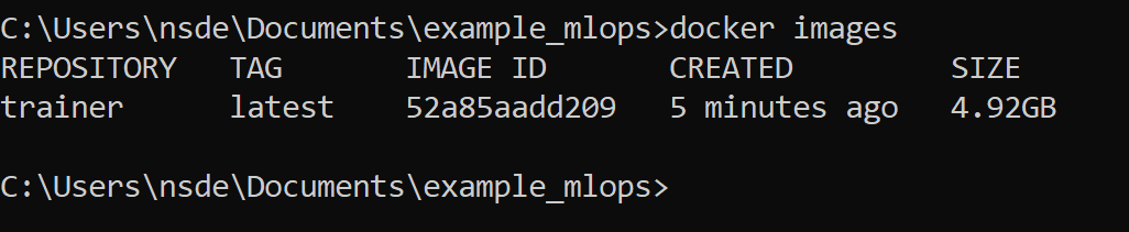 docker build. The-f train.dockerfile .(the dot is important to remember) indicates which Dockerfile we want to run (except if you just named itDockerfile) and the-t train:latestis the respective name and tag that we see afterward when runningdocker images(see image below). Please note that building a Docker image can take a couple of minutes.Docker images and space