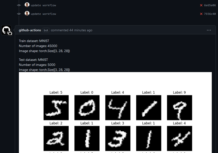 jobs: dataset_statistics: runs-on: ubuntu-latest steps: # ...all the previous steps - name: Check data statistics & generate report run: | python src/example_mlops/data.py > data_statistics.md echo '' >> data_statistics.md echo '' >> data_statistics.md echo '' >> data_statistics.md - name: Setup cml uses: iterative/setup-cml@v2 - name: Comment on PR env: REPO_TOKEN: ${{ secrets.GITHUB_TOKEN }} run: | cml comment create data_statistics.md --watermark-title="Data Checker" # (1)!The