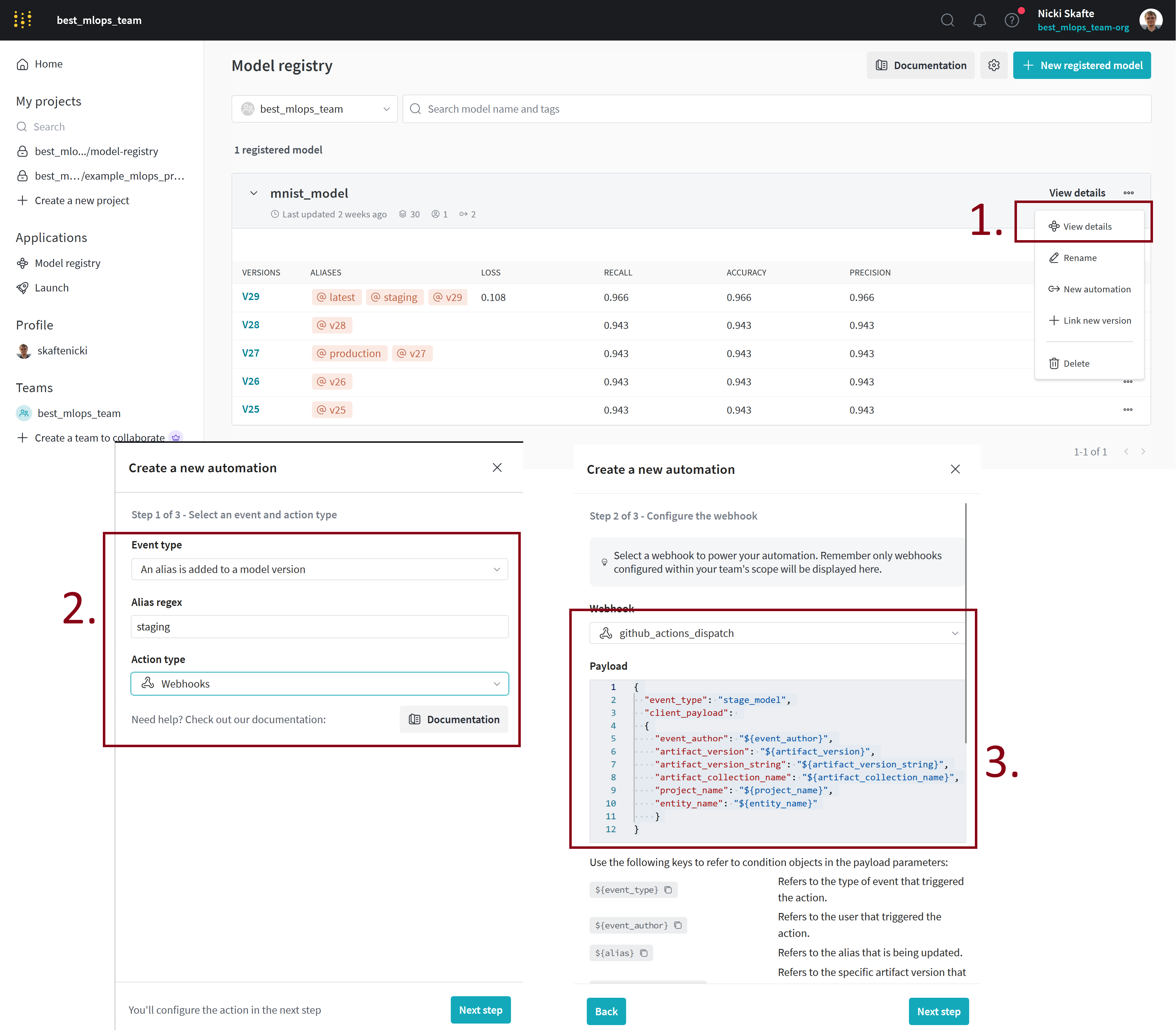 View detailsbutton. Then click theNew automationbutton. On the first page, select that you want to trigger the automation when an alias is added to a model version, set that alias tostagingand select the action type to beWebhook. On the next page, select thegithub_actions_dispatchwebhook that you just created and add this as the payload:{ "event_type": "staged_model", "client_payload": { "event_author": "${event_author}", "artifact_version": "${artifact_version}", "artifact_version_string": "${artifact_version_string}", "artifact_collection_name": "${artifact_collection_name}", "project_name": "${project_name}", "entity_name": "${entity_name}" } }Finally, on the next page give the automation a name and click