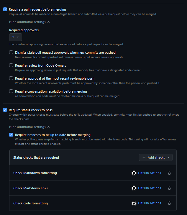 The first rule to consider is Require a pull request before merging. As the name suggests, this rule requires that changes that are to be merged into the main branch must be done through a pull request. This is a good practice as it allows for code review and testing before the code is merged into the main branch. Additionally, this opens the option to specify that the code must be reviewed (or at least approved) by a certain number of people.