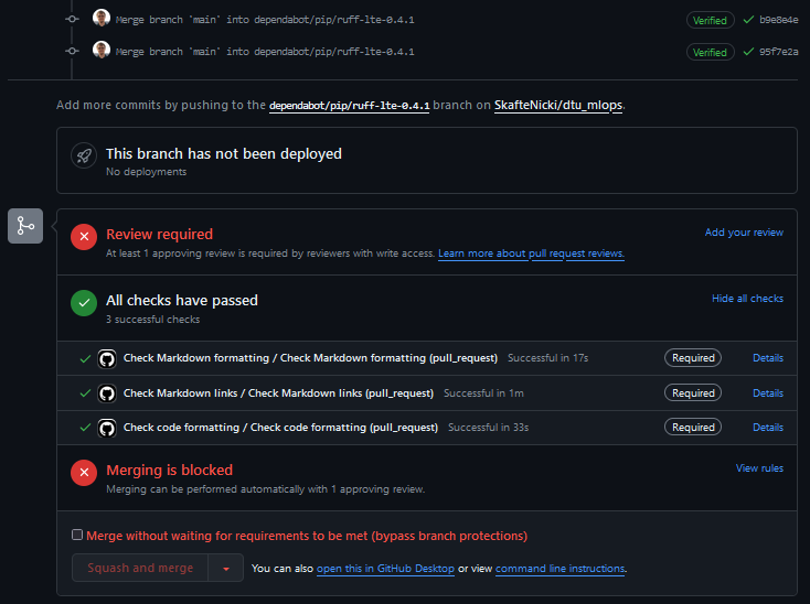 If you have created the rules correctly you should see something like the image below when you try to merge a pull request. In this case, all three checks are required to pass before the code can be merged. Additionally, a single reviewer is required to approve the code. A bypass rule is also setup for the repository admin.