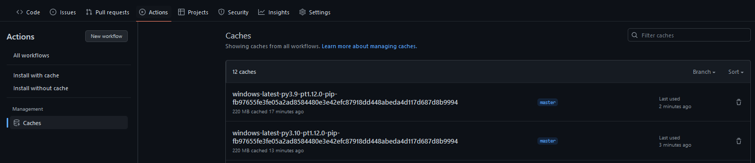 Actions->Cachesin your repository and make sure that they are correctly added. It should look something like the image below. -