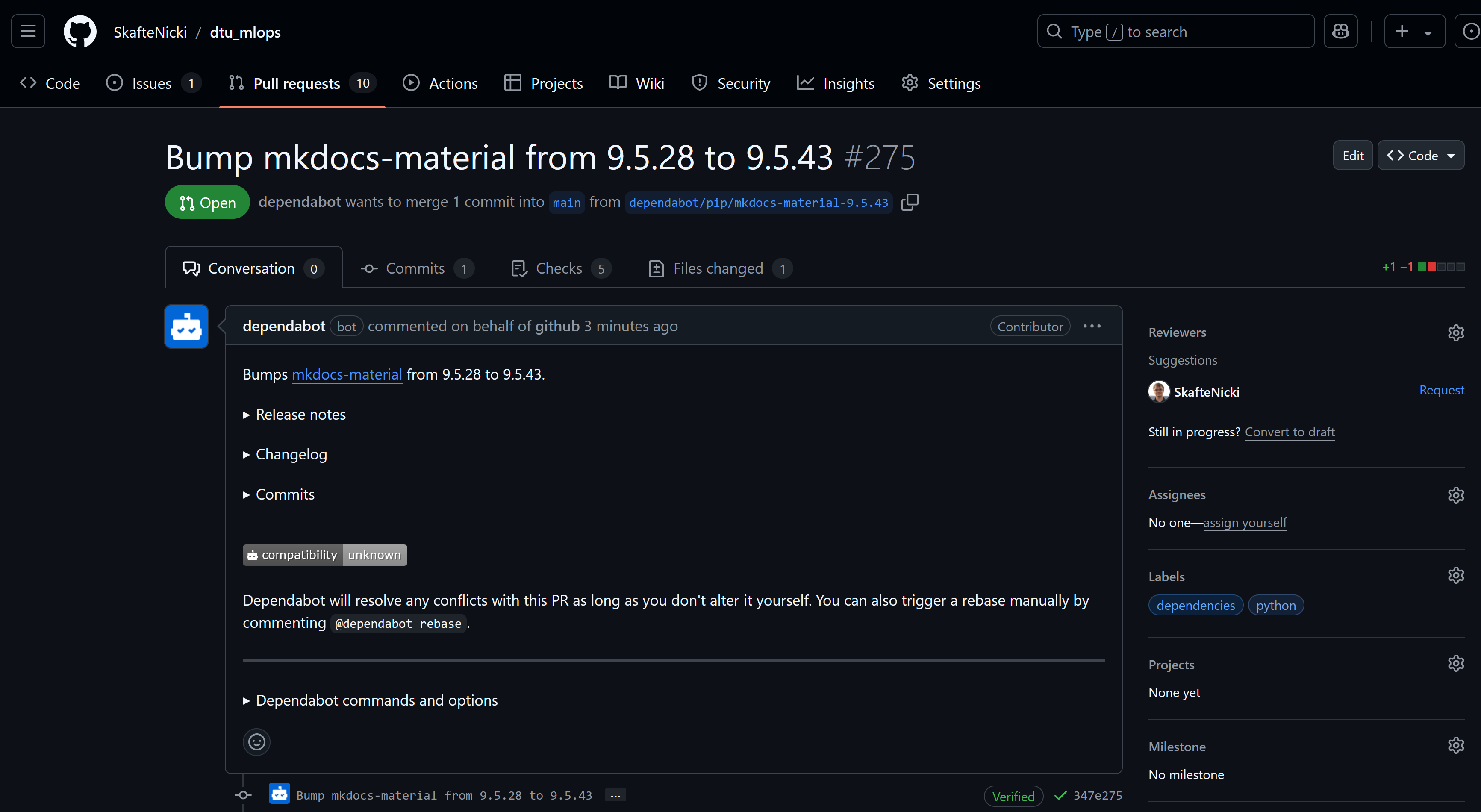 # lets assume pytorch v2.5 is the latest version # these different specifications will not trigger dependabot because # the latest version is included in the specification torch torch == 2.5 torch >= 2.5 torch ~= 2.5 # these specifications will trigger dependabot because the latest # version is not included torch < 2.5 torch == 2.4 torch <= 2.4If you have a pull request from Dependabot, check it out and see if it looks good. If it does, you can merge it.