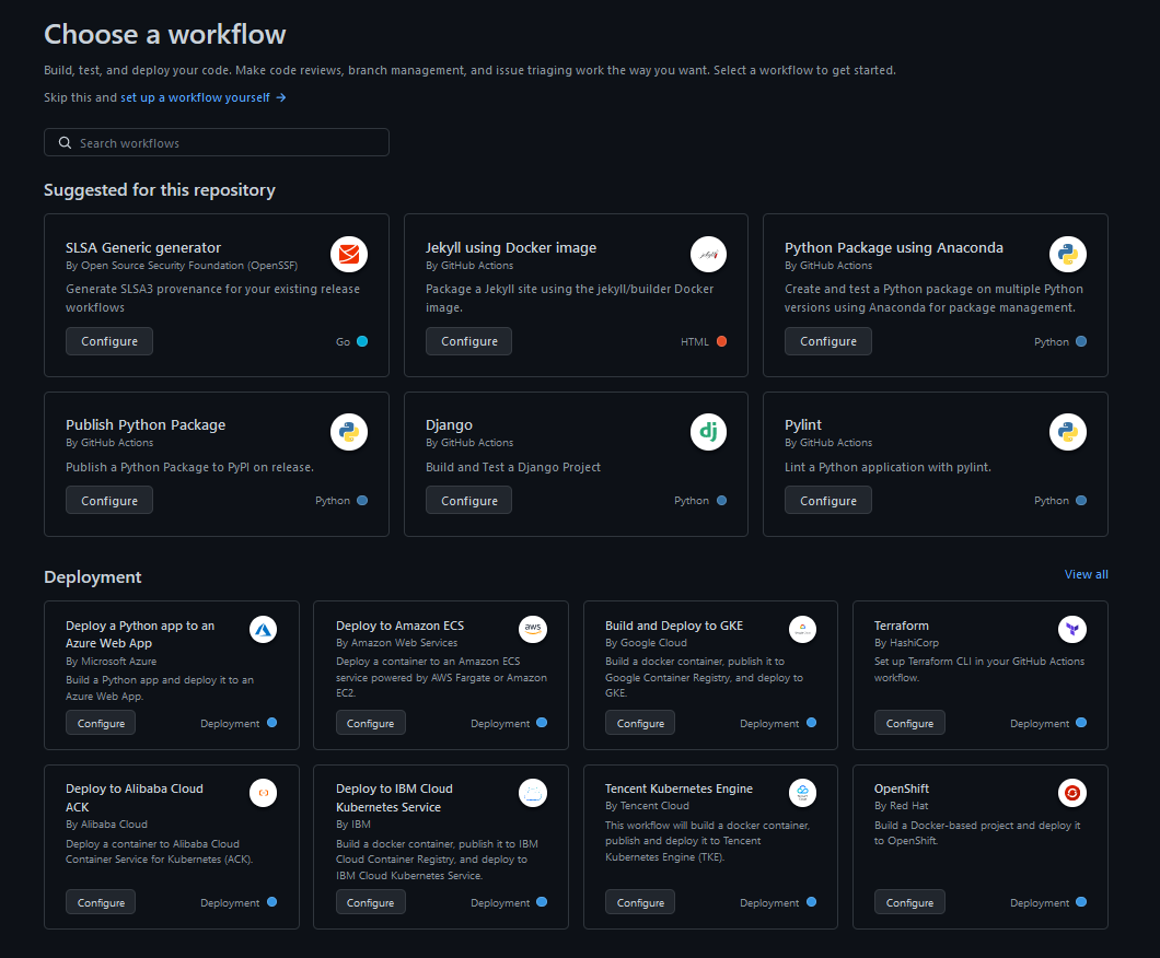 This ends the module on GitHub workflows. If you are more interested in this topic you can check out module M31 on documentation which first includes locally building some documentation for your project and afterward using GitHub actions for deploying it to GitHub Pages. Additionally, GitHub also has a lot of templates already for running different continuous integration tasks. If you try to create a workflow file directly in GitHub you may encounter the following page: