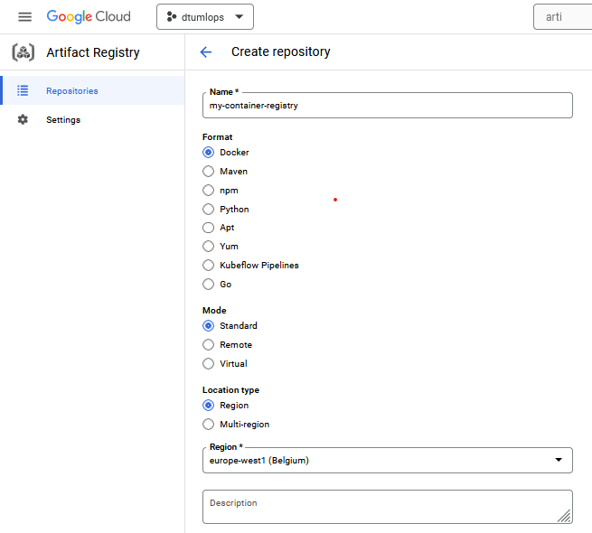 europe-west1-docker.pkg.dev/dtumlops-335110/container-registrywould be a valid URL (this is the one I created). -