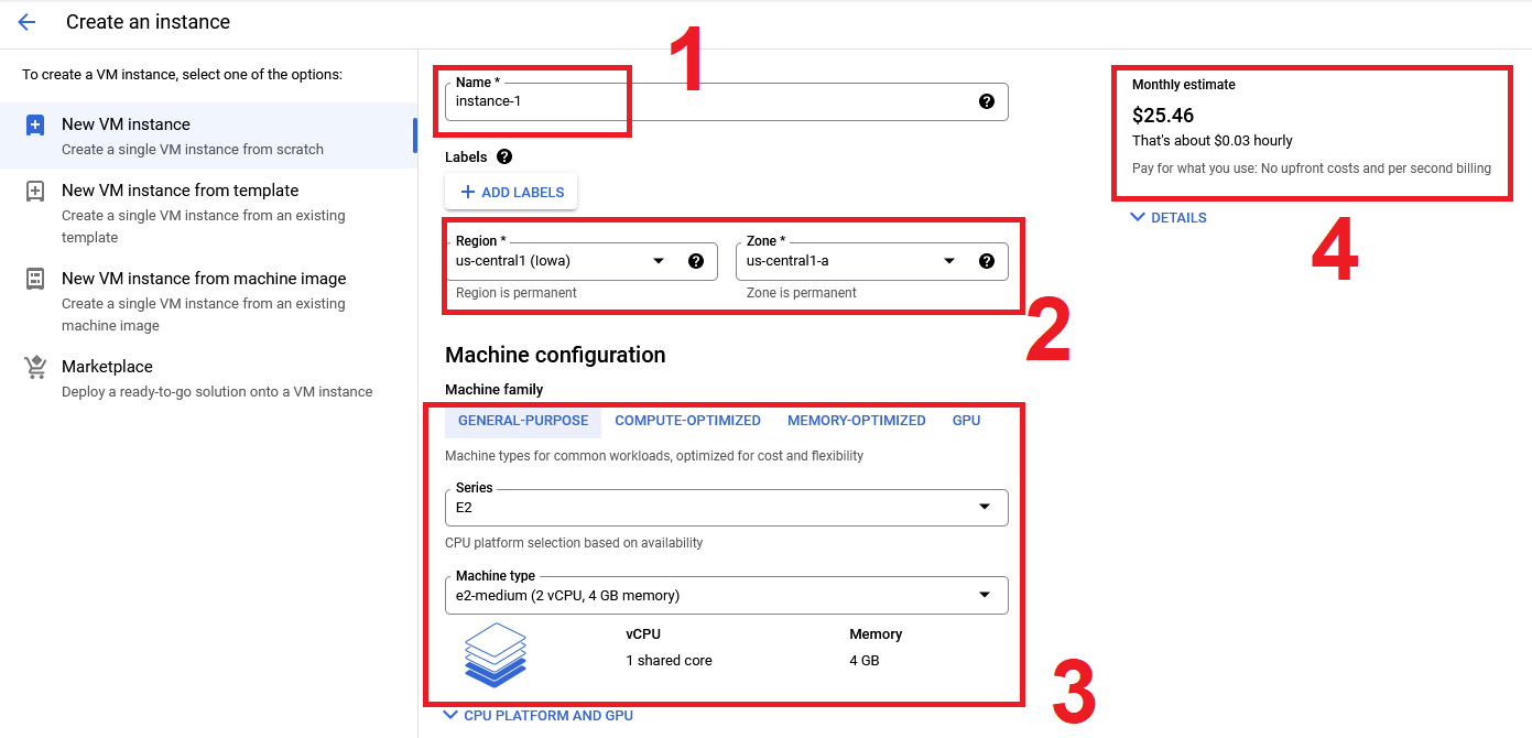 europe-west-1). Finally, try to adjust the configuration a bit. Can you find at least two settings that alter the price of the virtual machine?Solution
