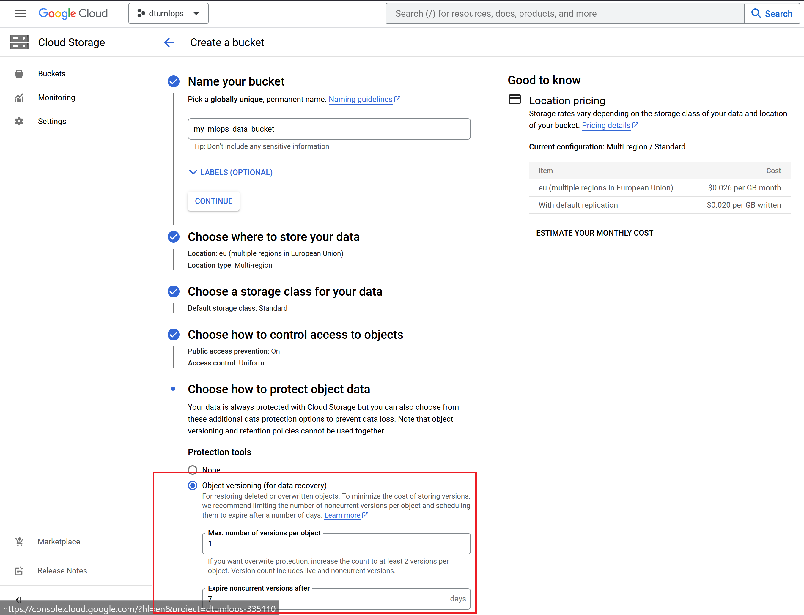 Cloud Storage. On the next page clickCreate bucket:Give the bucket a unique name, set it to a region close by and importantly remember to enable Object versioning under the last tab. Finally, click