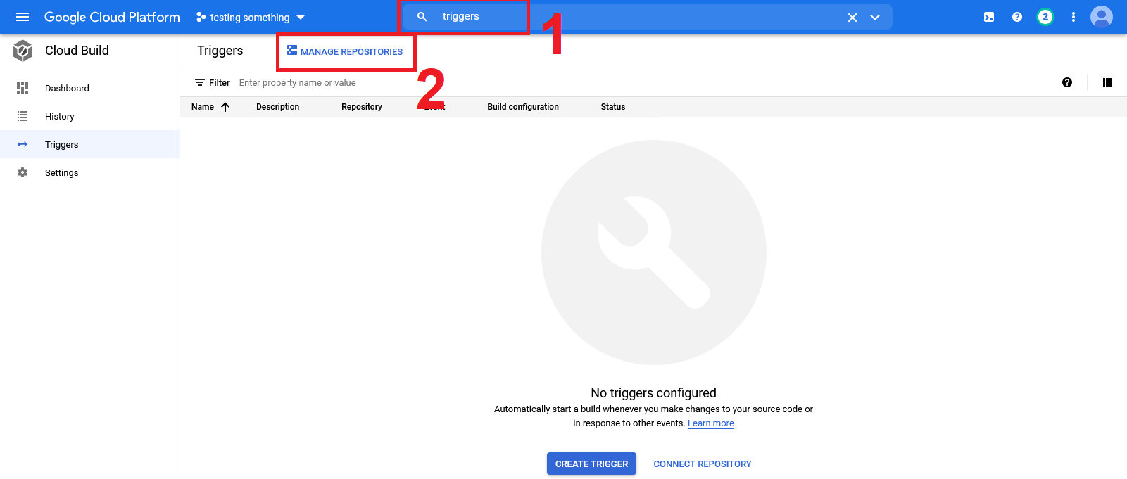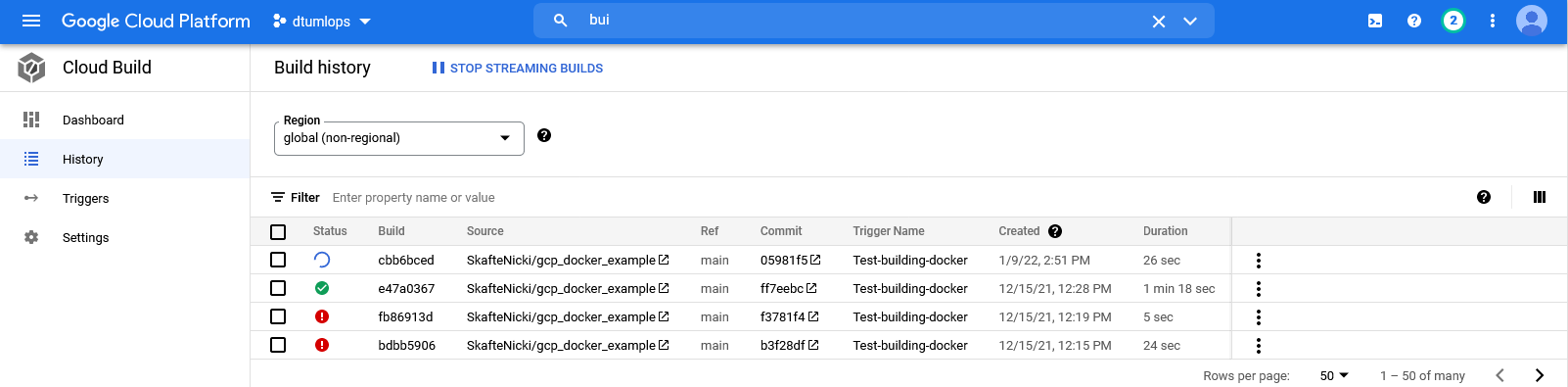 Cloud Buildpage and you should see the image being built and pushed.Try clicking on the build to check out the build process and build summary. As you can see from the image, if a build is failing you will often find valuable info by looking at the build summary. If your build is failing try to configure it to run in one of these regions: