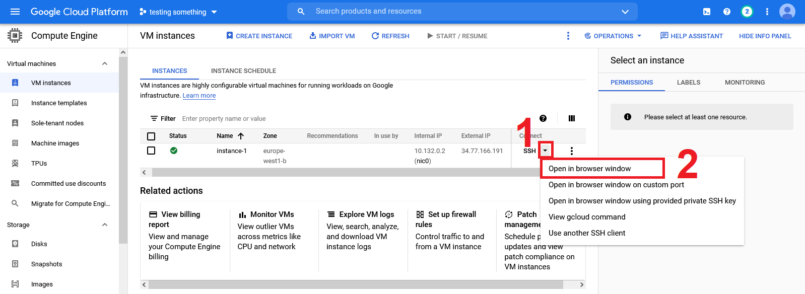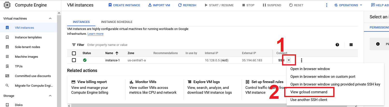 sshinto a VM by selecting theView gcloud commandoption in the Compute Engine overview (see image below). -