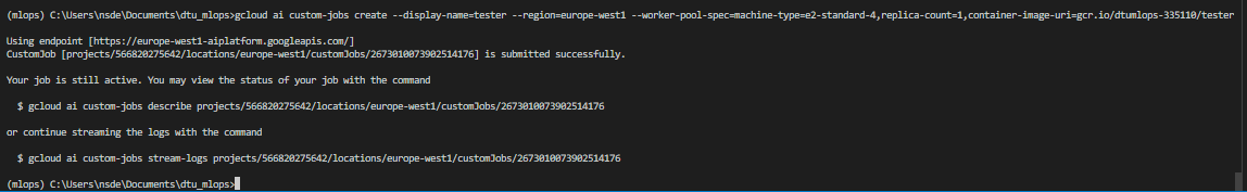 gcloud ai custom-jobs createcommand. An example here would be:gcloud ai custom-jobs create \ --region=europe-west1 \ --display-name=test-run \ --config=config.yaml \ # these are the arguments that are passed to the container, only needed if you want to change defaults --command 'python src/my_project/train.py' \ --args=--epochs=10 --args=--batch-size=128Essentially, this command combines everything into one command: it first creates a VM with the specs specified by a configuration file, then loads a container specified again in the configuration file, and finally it runs everything. An example of a config file could be: