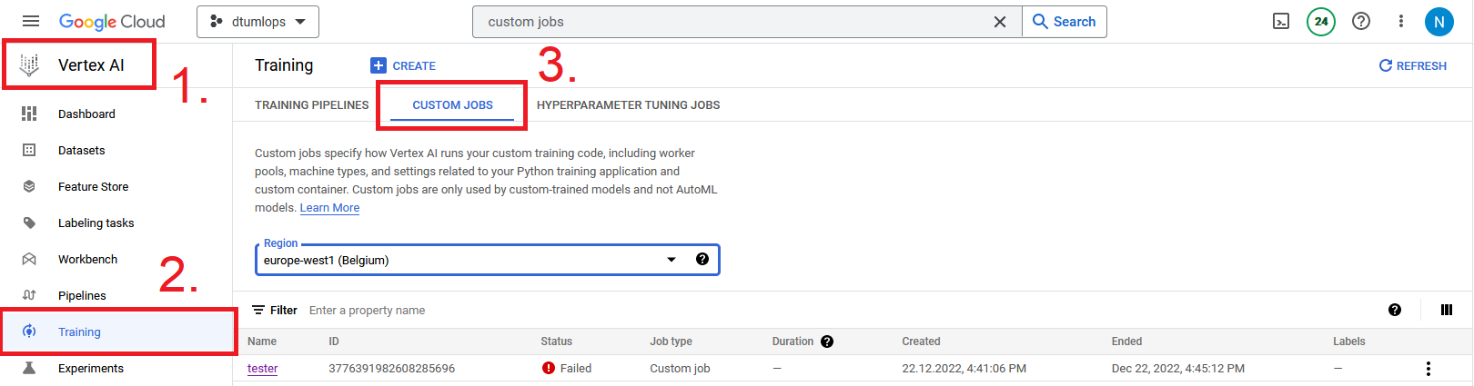 Custom Jobstab in thetrainingpart of Vertex AI.You will need to select the specific region that you submitted your job to in order to see the job.