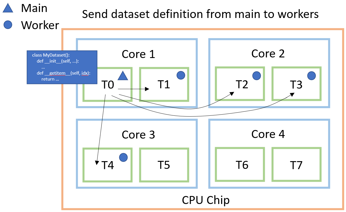 all threads have a copy of our dataset definition so each can call the __getitem__ method.