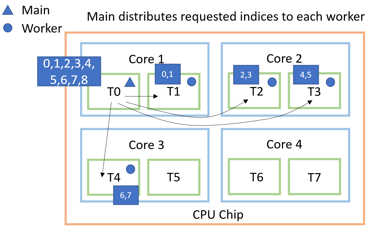 to the four worker threads. With 8 indices and 4 workers, each worker will receive 2 indices.