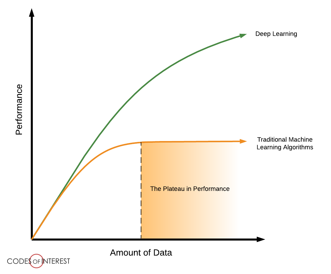 One way that deep learning fundamentally changed the way we think about data in machine learning is that more data is always better. This was very much not the case with more traditional machine learning algorithms (random forest, support vector machines, etc.) where a plateau in performance was often reached for a certain amount of data and did not improve if more was added. However, as deep learning models have become deeper and deeper, more and more data-hungry performance seems to be ever-increasing or at least not reaching a plateau in the same way as for traditional machine learning.